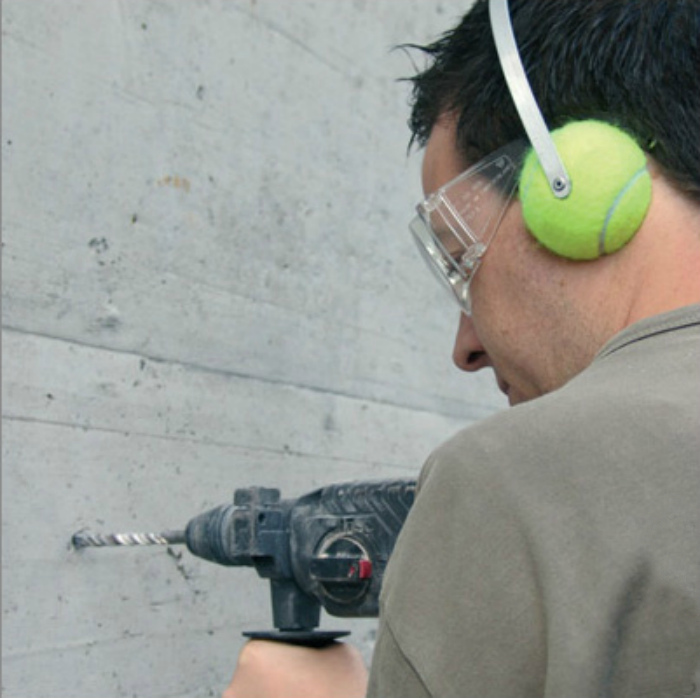 Теннисный мячик можно использовать для создания шумоизолирующих наушников, которые будут весьма кстати при проведении строительных работ дома или на даче. Для этого, мячик нужно разрезать напополам и скрепить его части дугой.