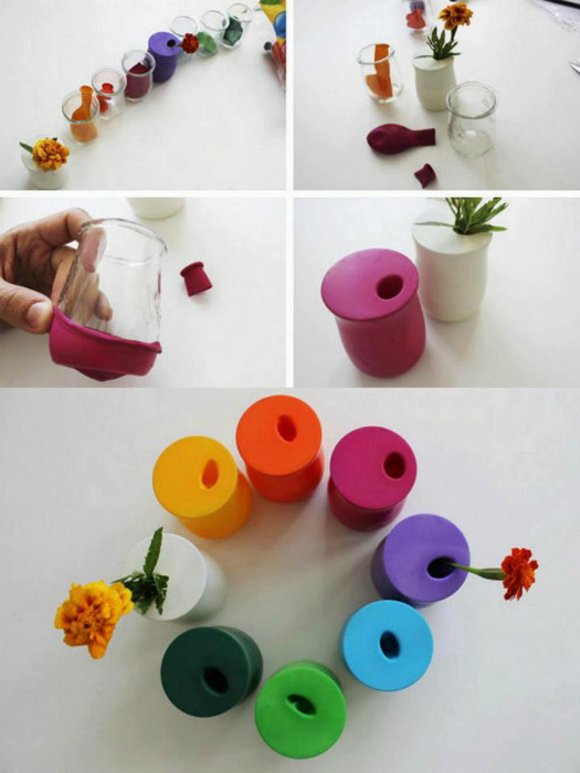 С помощью воздушных шариков разных цветов можно декорировать обычные стеклянные стаканы, превращая их в яркие вазы для небольших букетиков цветов.