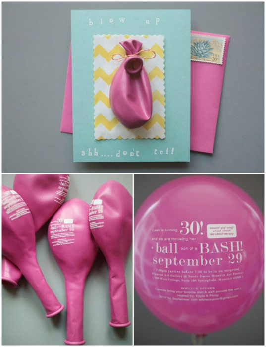Надуйте шарики, красиво напишите на них приглашения на торжество, выпустите воздух, прикрепите шарики к открыткам и раздайте друзьям, которые смогут прочитать текст приглашения лишь надув шарик. Такие необычные пригласительные поразят друзей и запомнятся на долго.